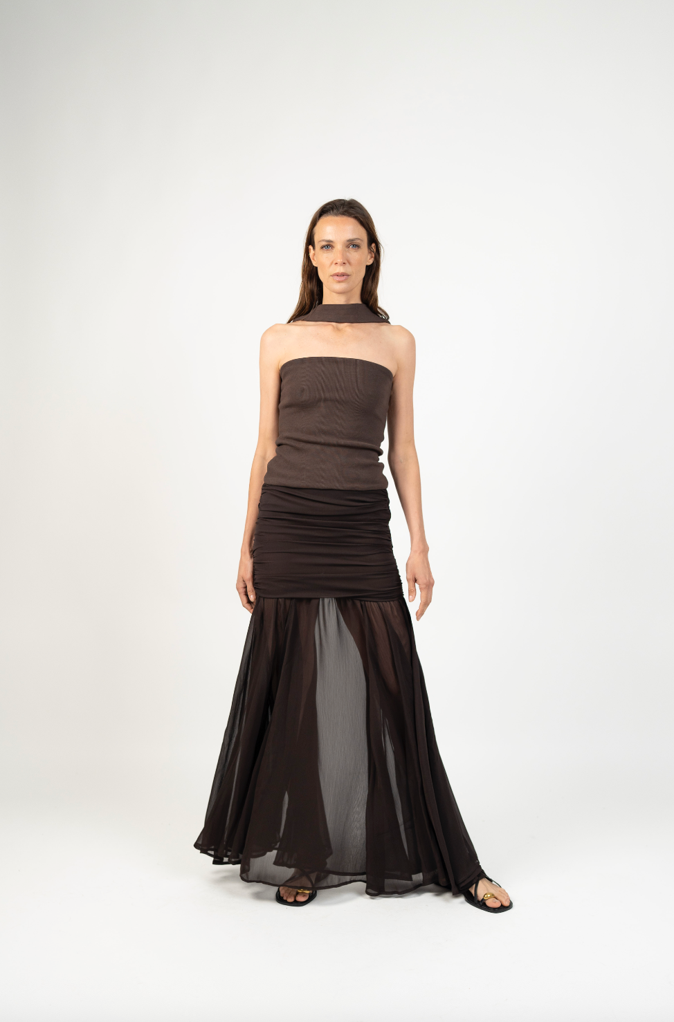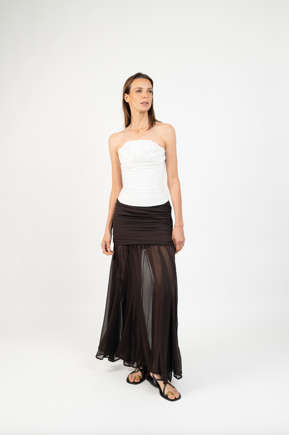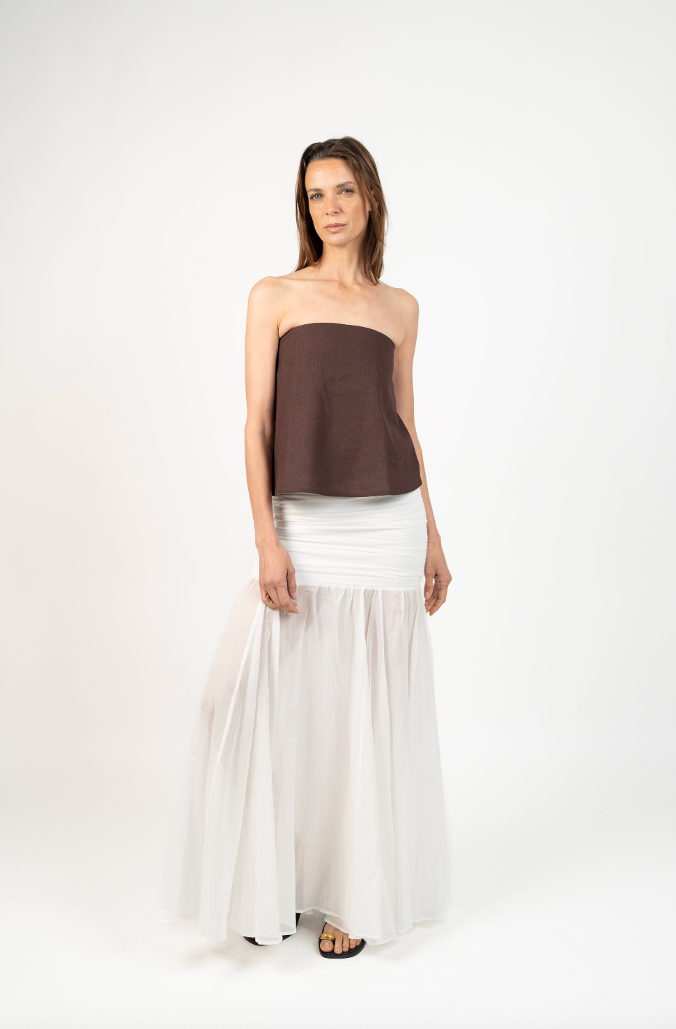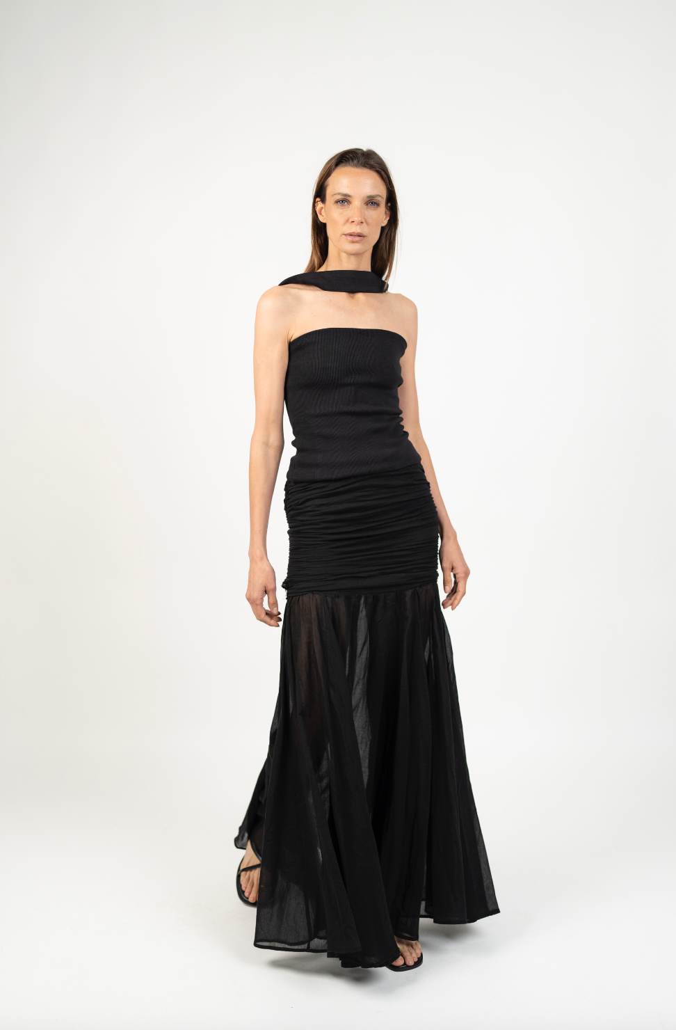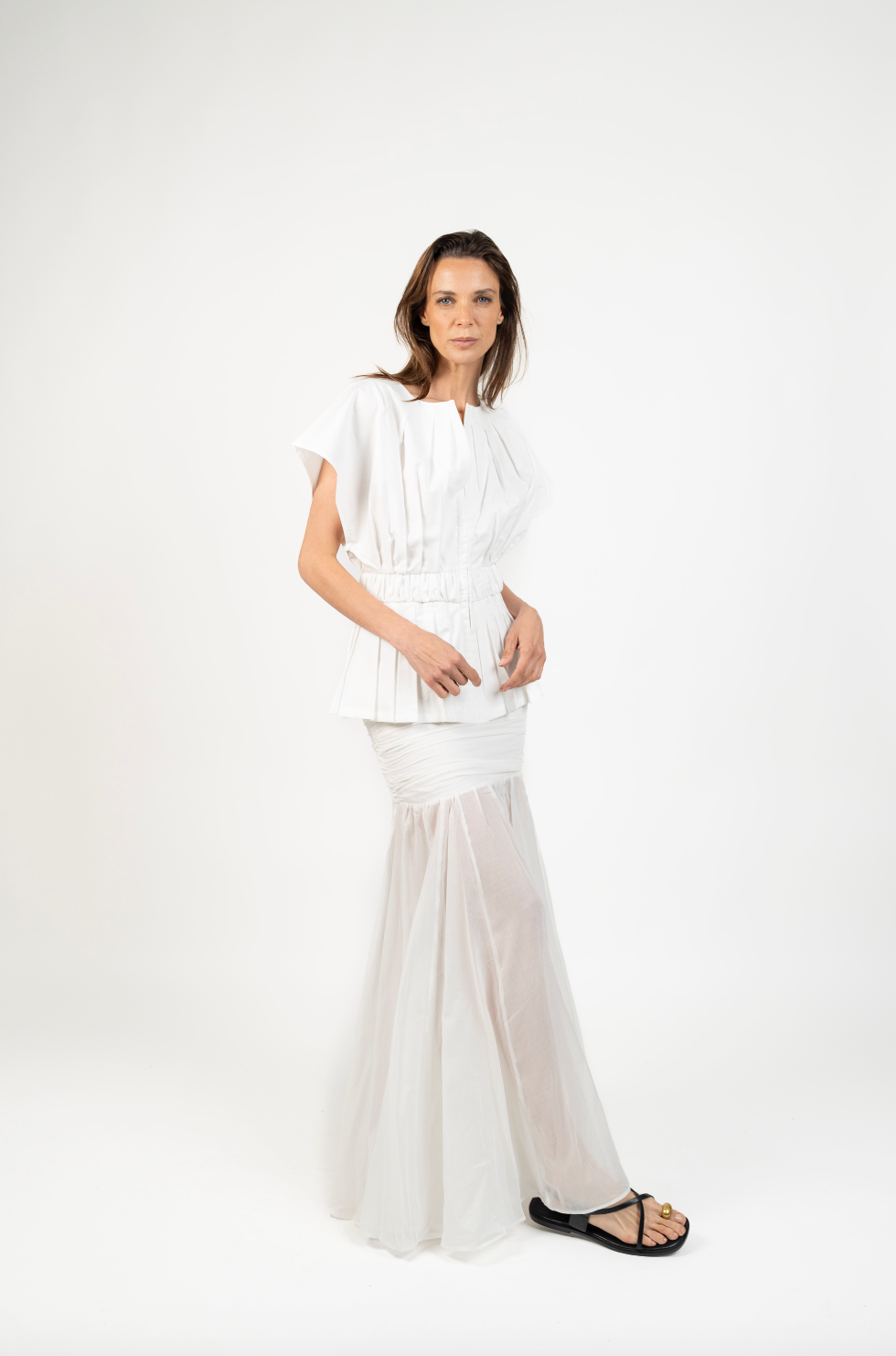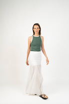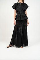 Fit NotesPretina ajustada en la parte superior con cierre invisible lateral para un calce limpio y cómodo.Falda amplia desde la cadera hacia abajo, con caída fluida y movimiento natural gracias a sus quillas.
