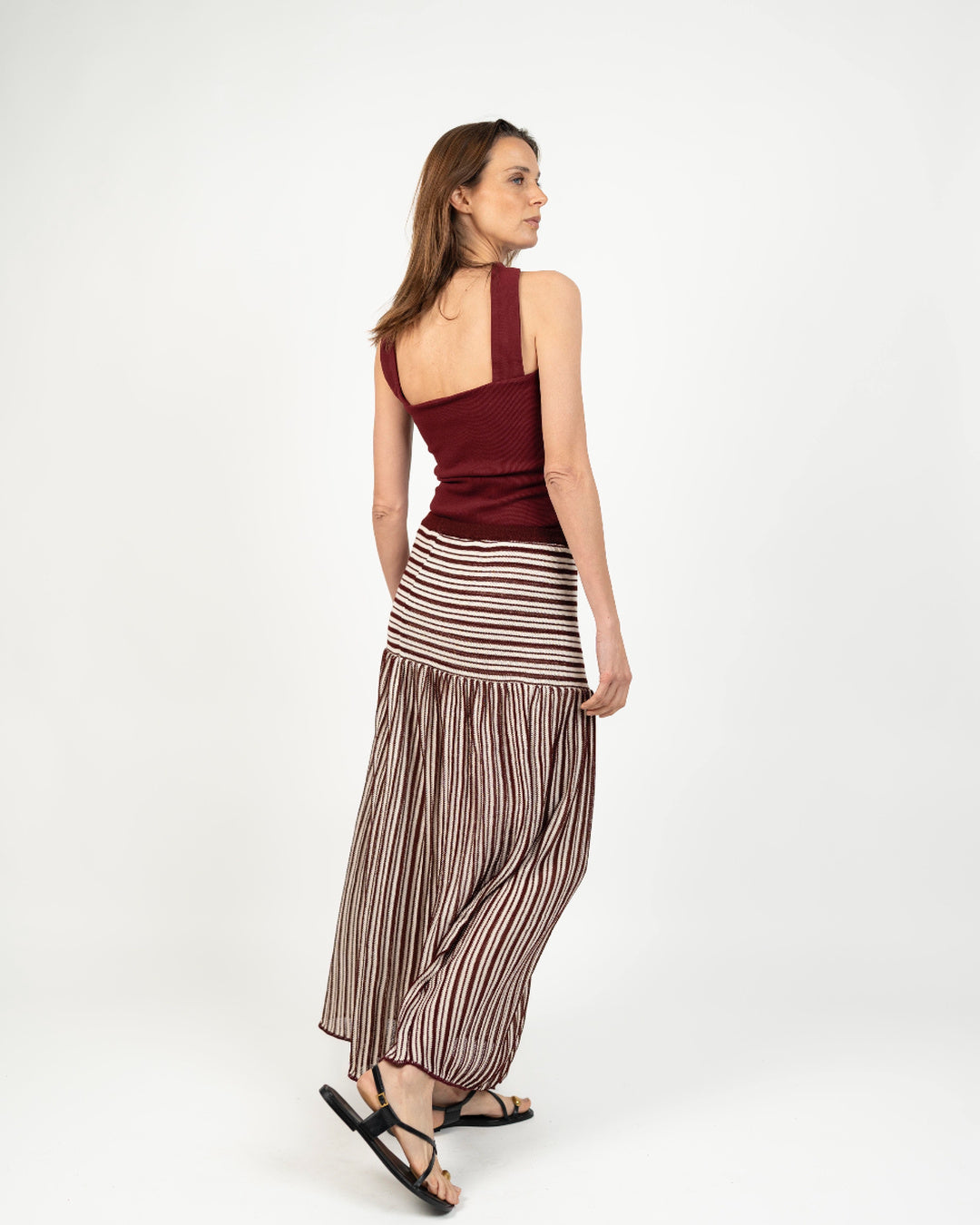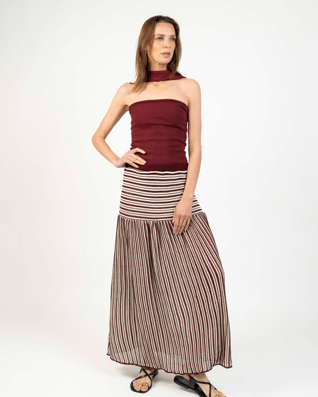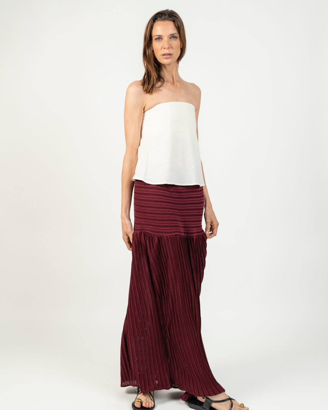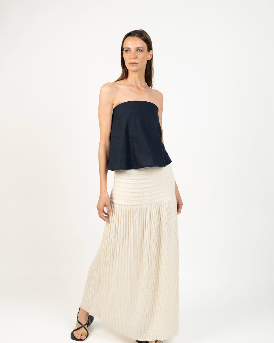Nuestra Falda tejida destaca por su movimiento fluido y silueta femenina. Confeccionada en tejido acanalado de punto, combina suavidad, textura y caída natural. Su diseño incorpora una pretina ancha que se ajusta cómodamente a la cintura. Una prenda versátil y atemporal que puede acompañarte tanto en el día como en la noche, manteniendo siempre un aire relajado y sofisticado.