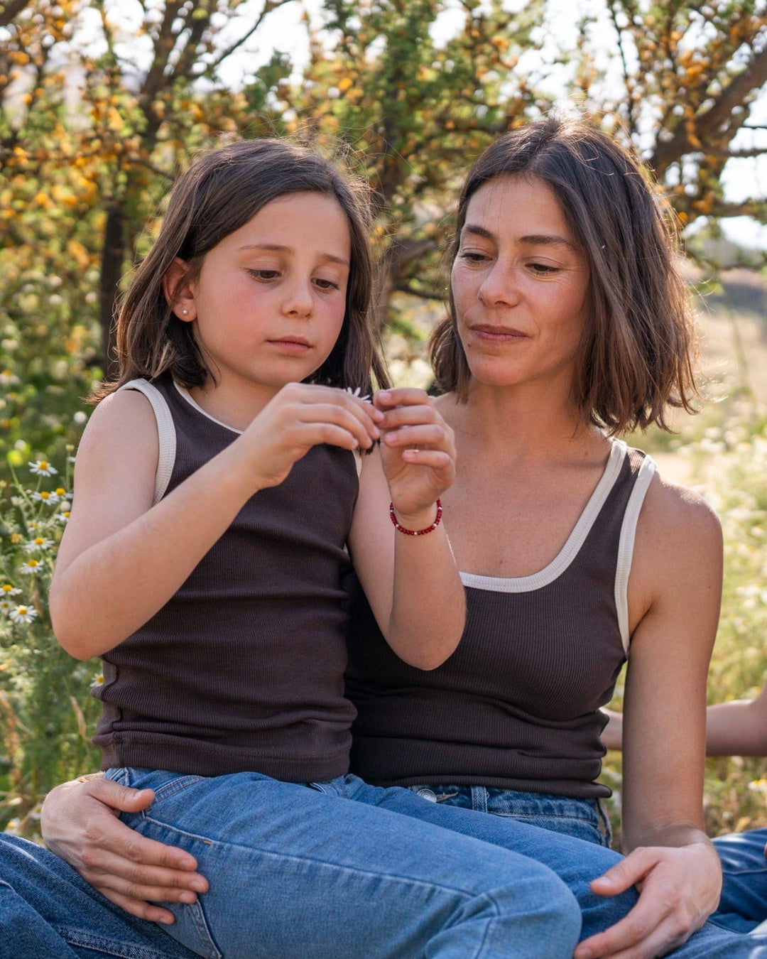 Tank top MARÍA POMBO infantil en café con borde crudo, diseñado para el día a día: suave, cómodo y con una elasticidad que acompaña el movimiento y el crecimiento. Su silueta limpia y su calce natural lo hacen ideal para usar solo o bajo una camisa liviana.