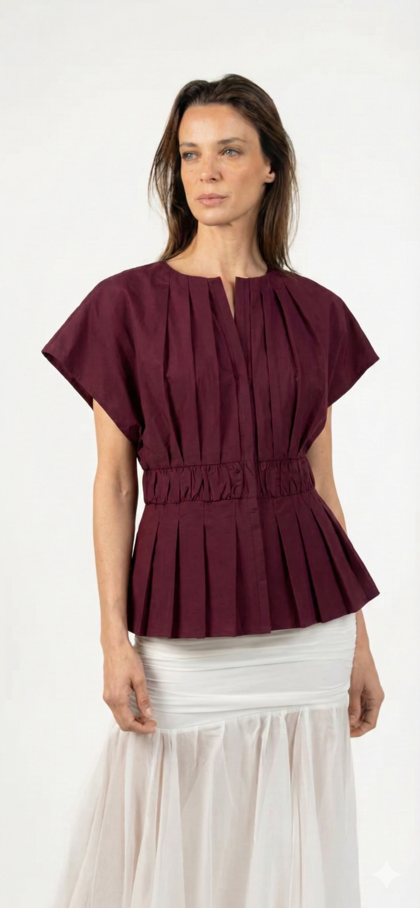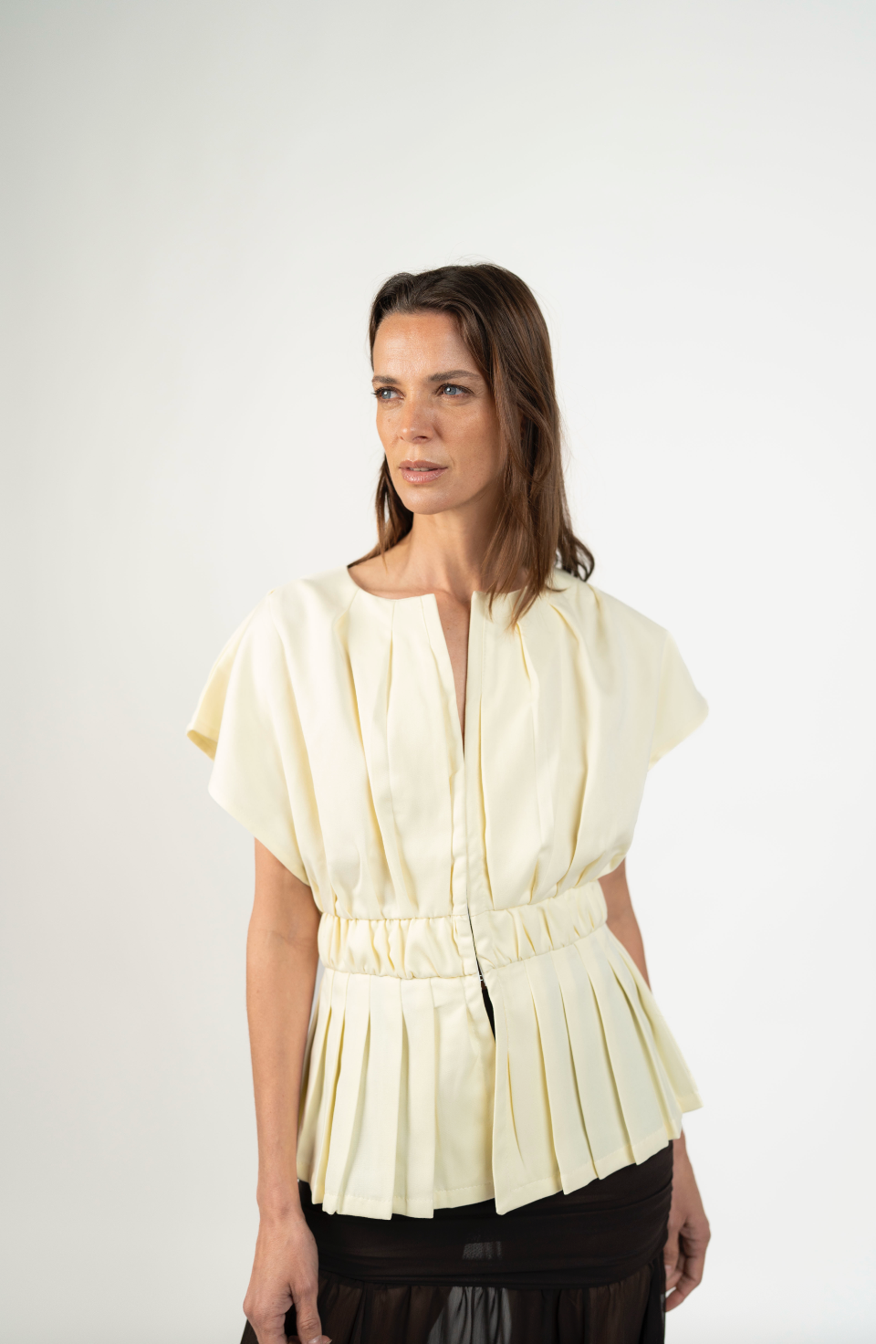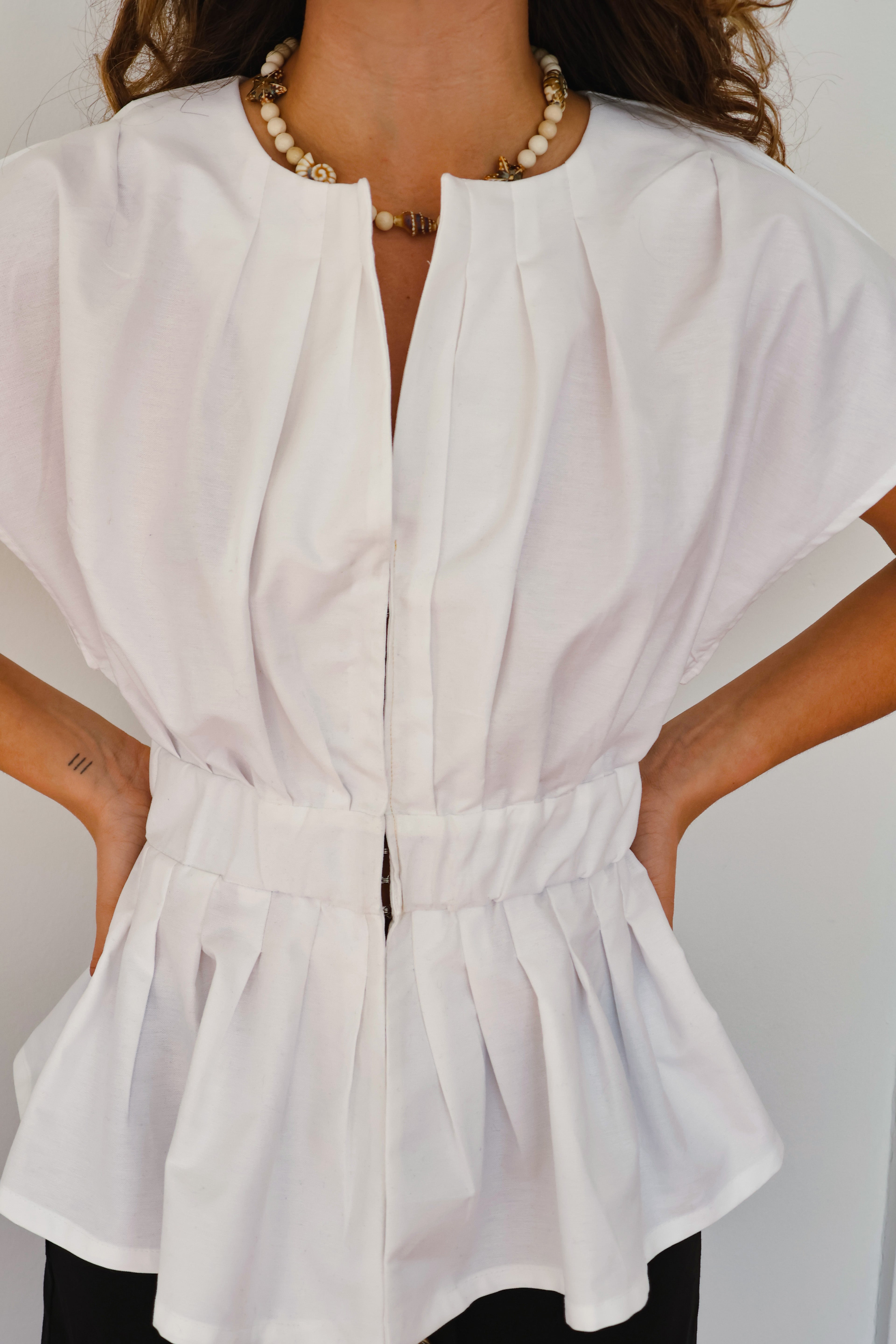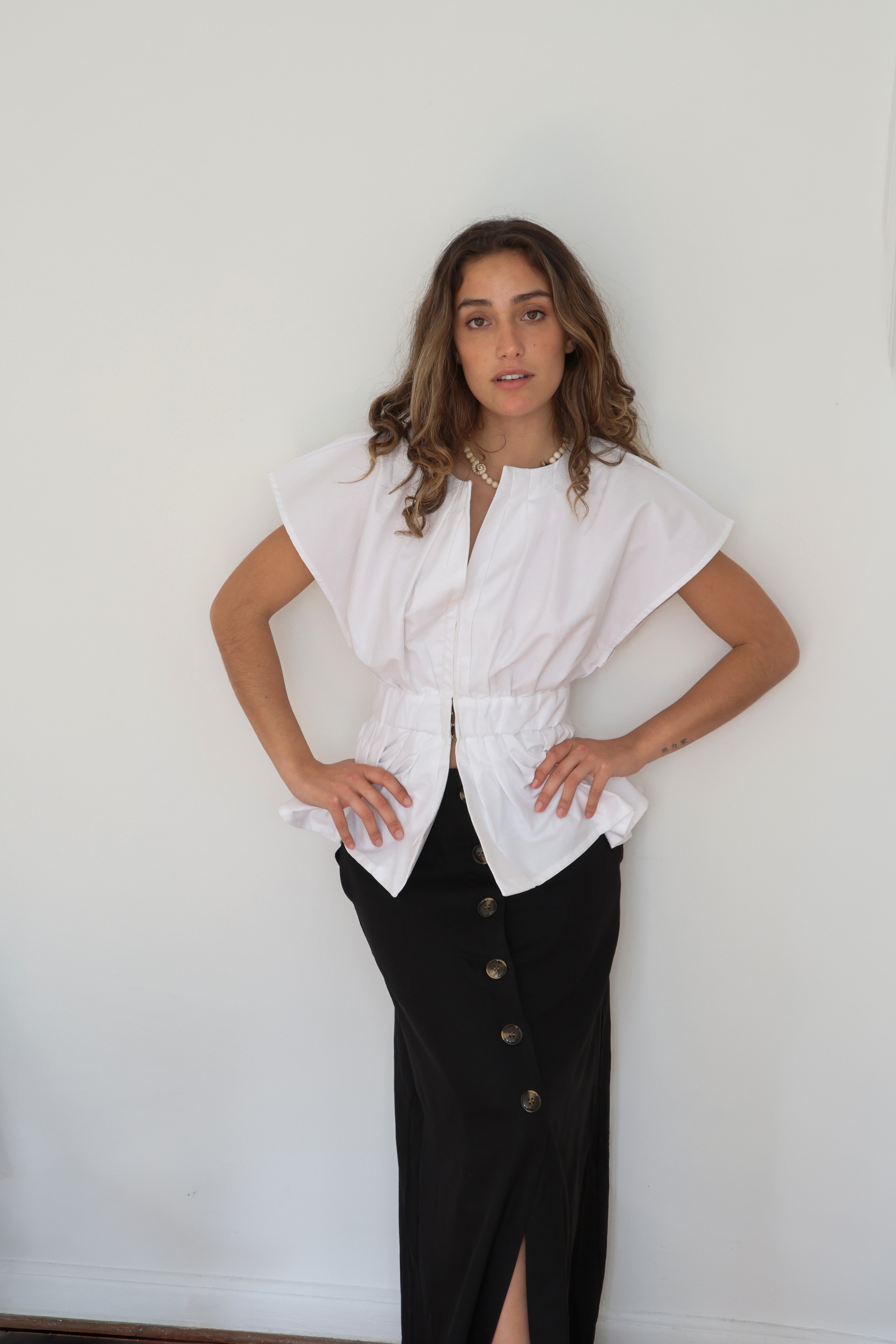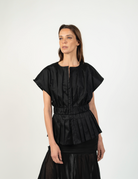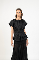 Un top femenino y estructurado que redefine el clásico peplum con un aire contemporáneo. Su silueta acentúa la cintura gracias a una pretina ancha que recoge delicados pliegues, creando un volumen elegante en el ruedo. Su cuello sutilmente abierto y las mangas amplias lo hacen ideal tanto para looks de día como para ocasiones más elevadas.