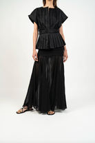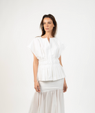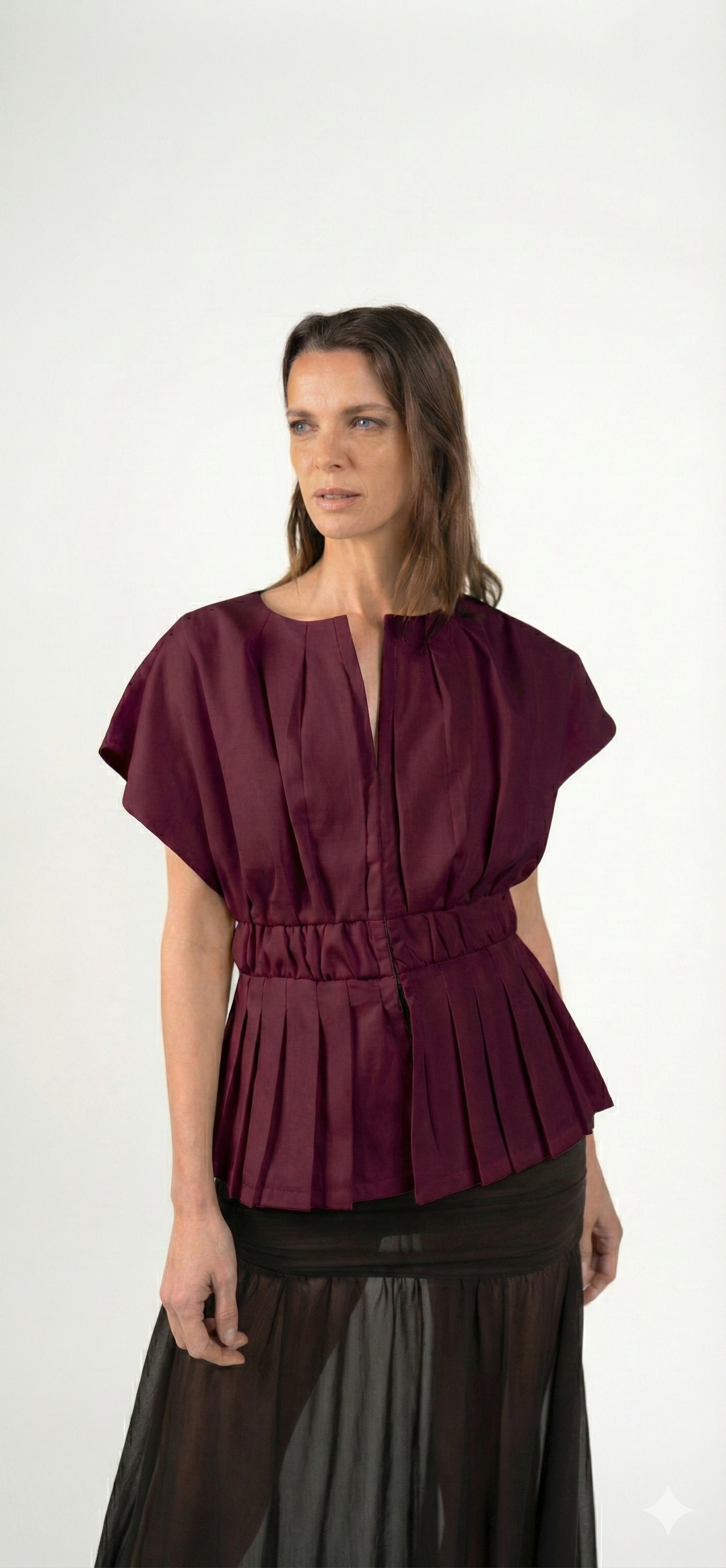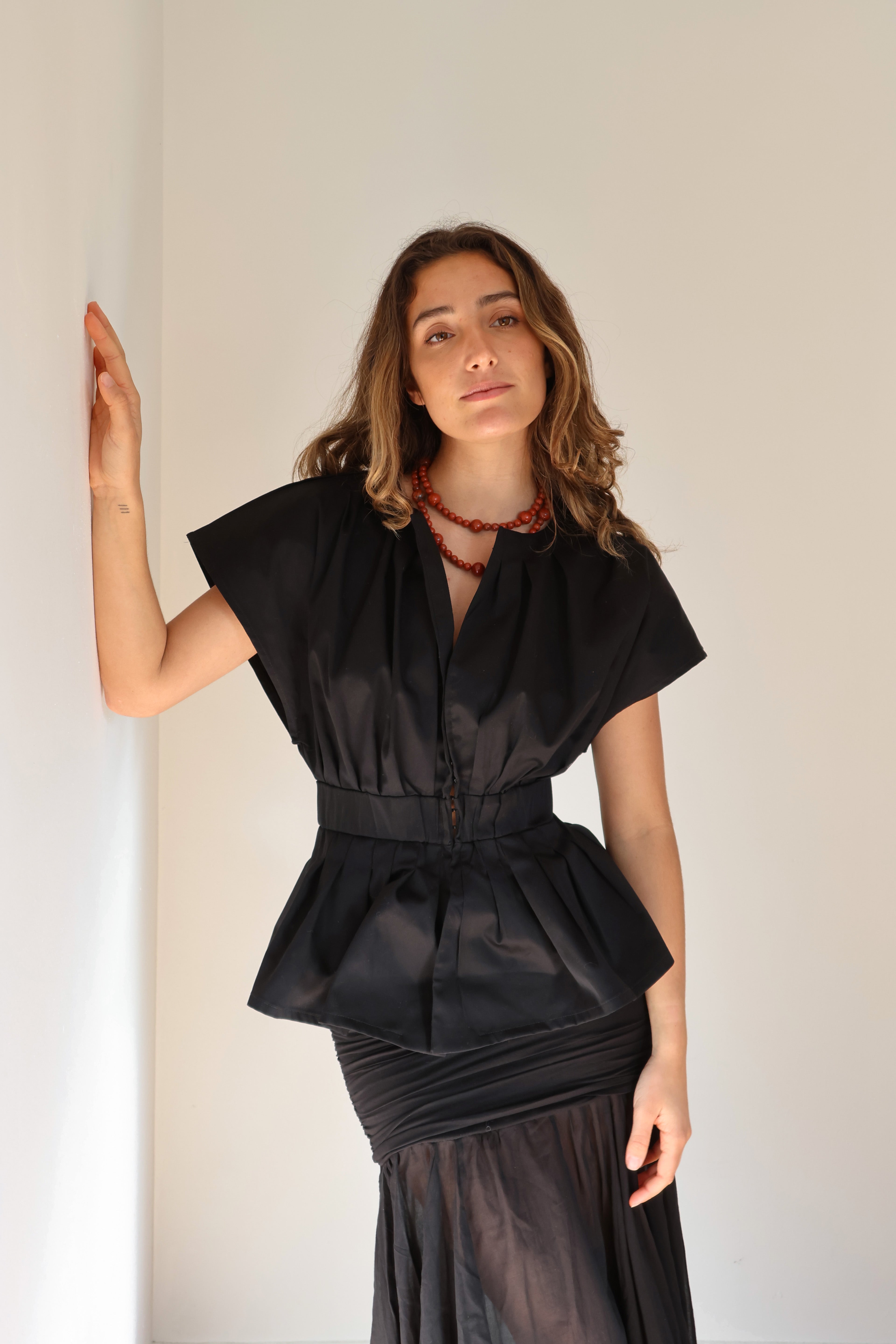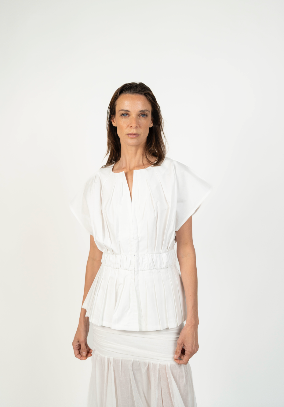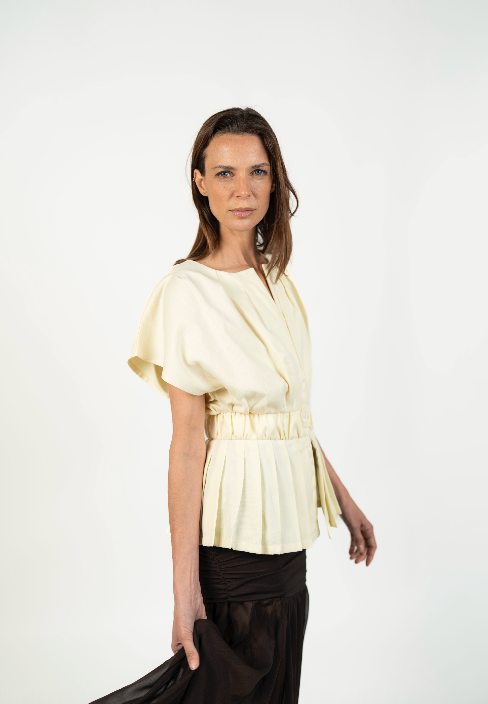 Un top femenino y estructurado que redefine el clásico peplum con un aire contemporáneo. Su silueta acentúa la cintura gracias a una pretina ancha que recoge delicados pliegues, creando un volumen elegante en el ruedo. Su cuello sutilmente abierto y las mangas amplias lo hacen ideal tanto para looks de día como para ocasiones más elevadas.